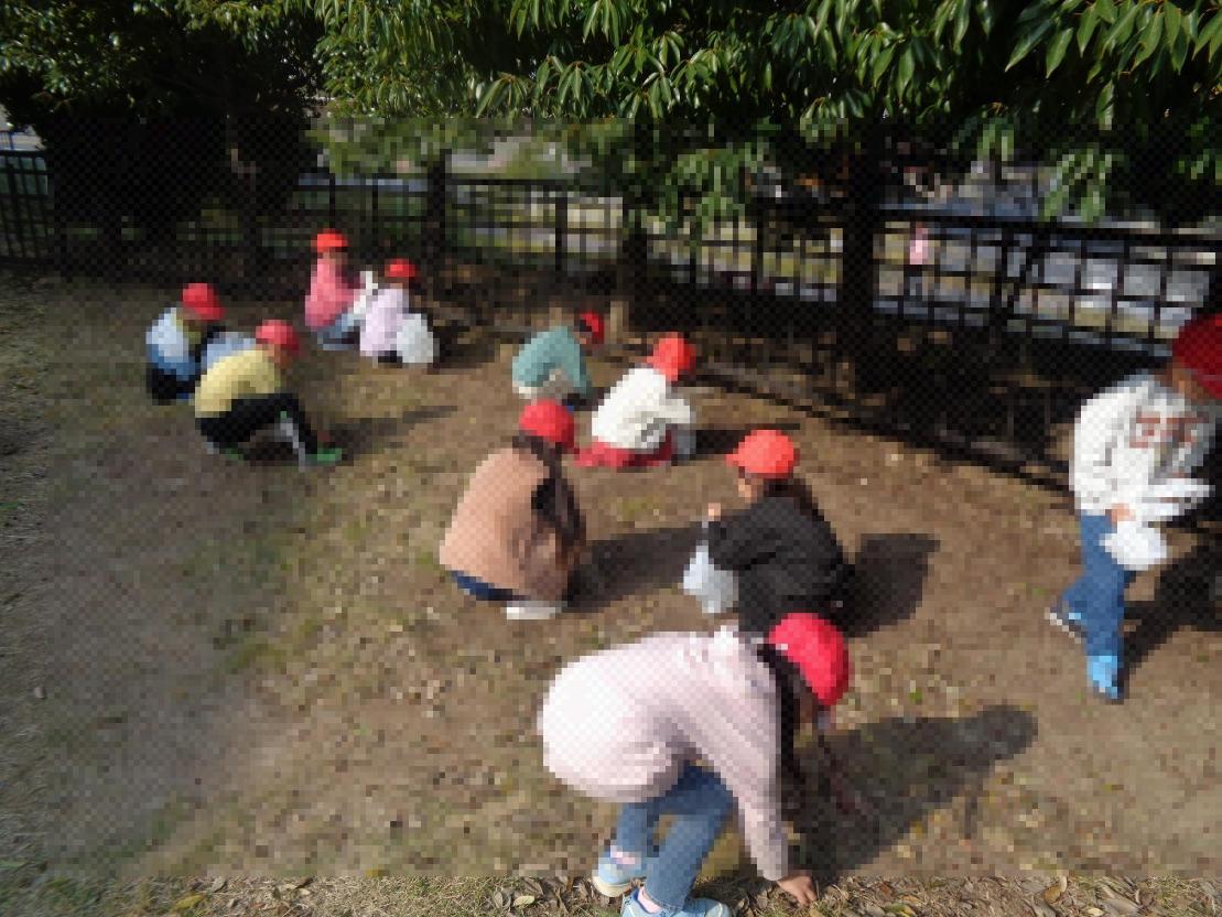 1年生がコロセアムや公園にどんぐりや落ち葉を拾いに行きました。