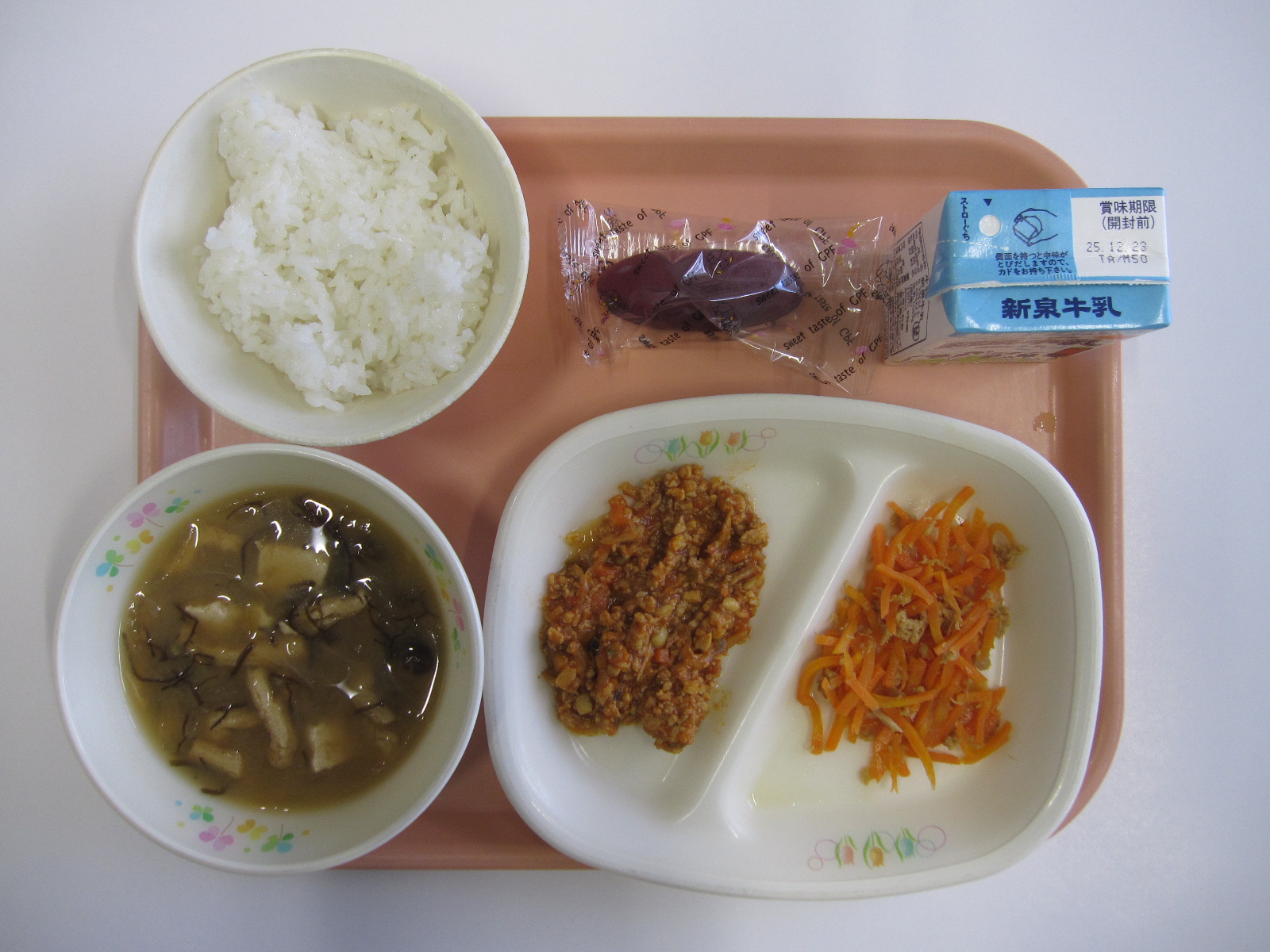 メニューは、沖縄を感じられる「タコライス・もずくのみそ汁・にんじんしりしり・ごはん・スイートポテト・牛乳」です。