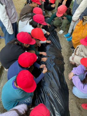 先週の金曜日に碓井豌豆の豆まきをしました。「ウスイエンドウ」は明治時代から大阪府羽曳野市碓井地区で栽培されている野菜で、甘味が強いのが特徴です。子どもたちにも地元の農作物の良さを感じて欲しいと願っての取り組みです。収穫後には給食後に提供される予定です。実るのが楽しみですね。