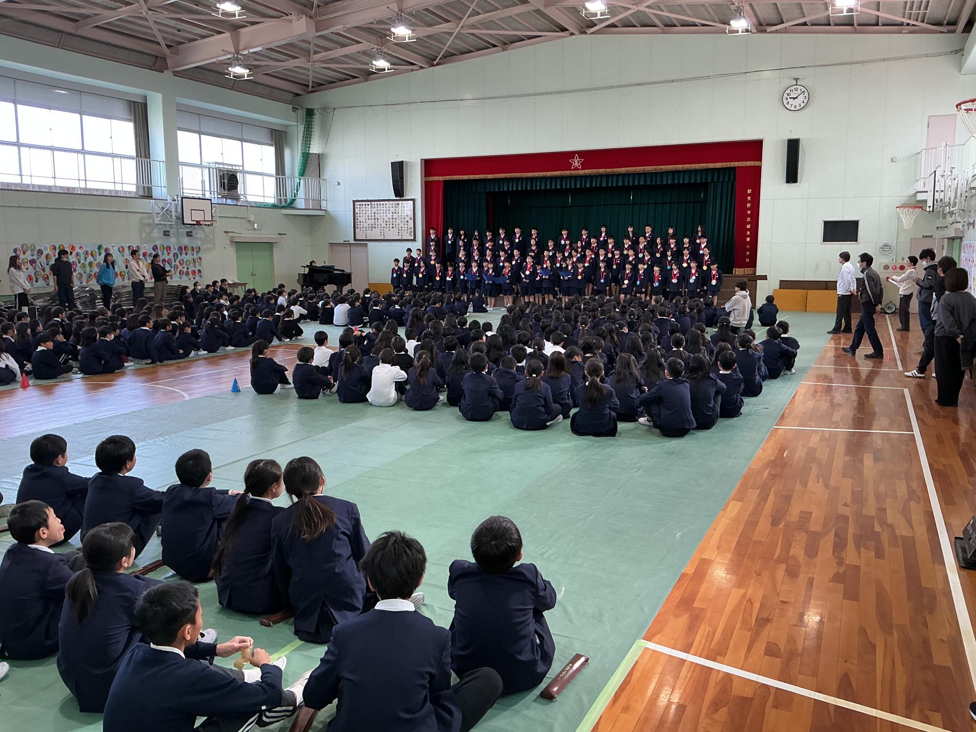 今日はお別れ集会をしました。ペア学年の1年生と一緒に登場した6年生。首からは1年生からプレゼントされたメダルが輝いていました。教職員からは「つばさをください」の合唱プレゼント。最後にはみんなで「音楽のおくりもの」を歌いました。1年間学校をリードしてくれた6年生に感謝の気持ちをみんなで伝えることができました。
