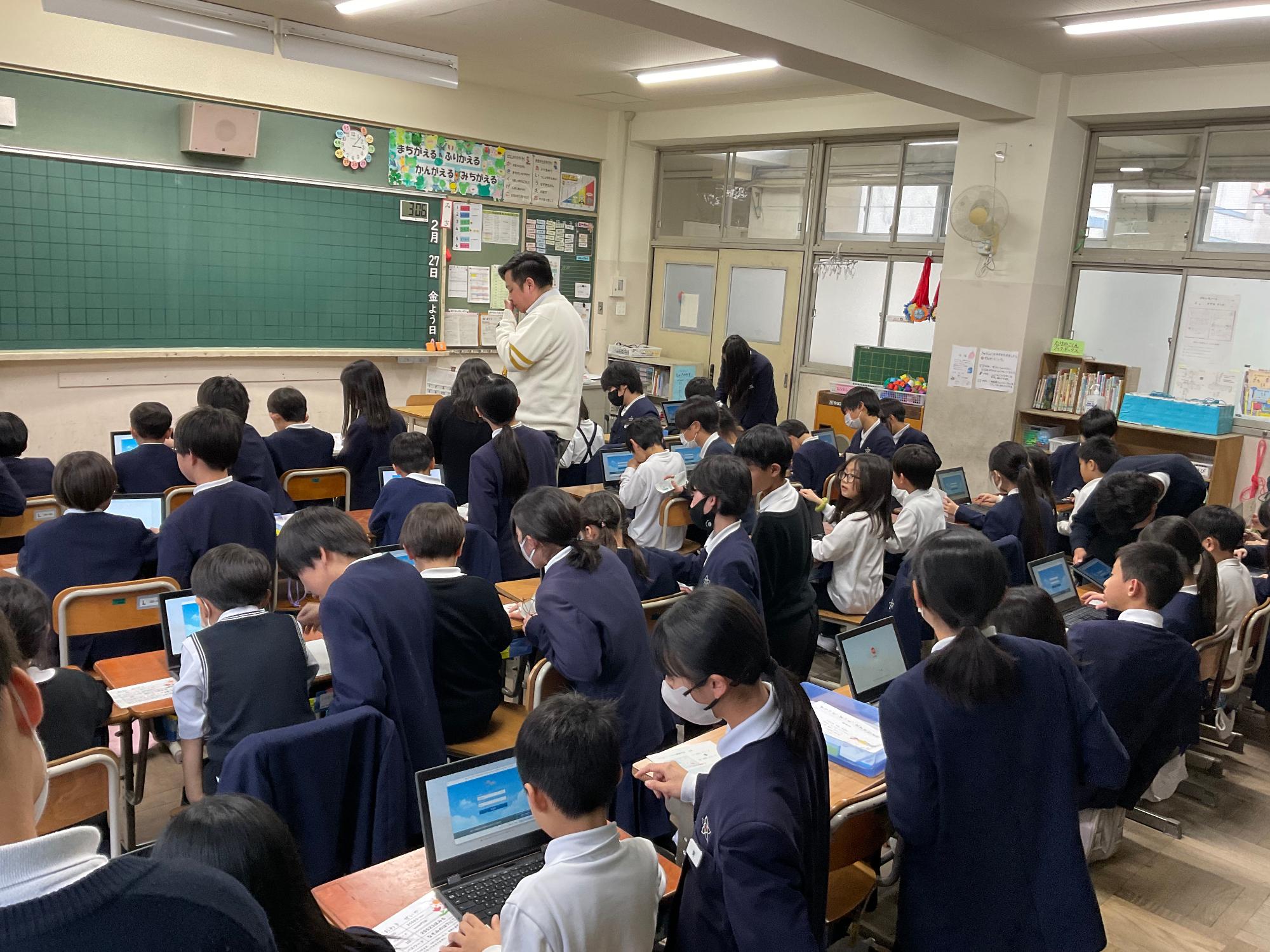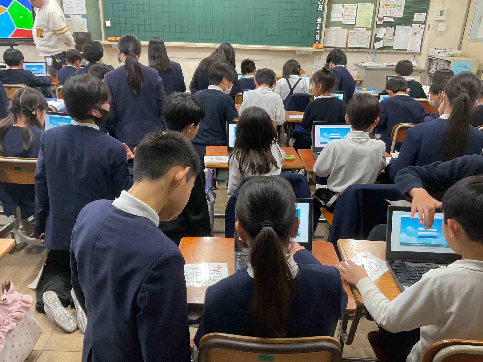 今まで1年生はQRコードを使ってログインしていましたが、これからはアカウントとパスワード入力でログインをすることに。その練習のために、ペア学年である6年生が教えに来てくれました。一つ一つ手順を丁寧に教えてくれ、この一年間ずっと交流してきた絆が見えました。