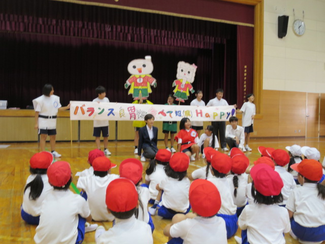 10月17日金曜日、峰塚中学校保健委員会のお兄さん・お姉さんが来てくれ、1年生対象に「バランスのよい食事のとり方」について、劇やダンスを交えながらお話してくれました。
