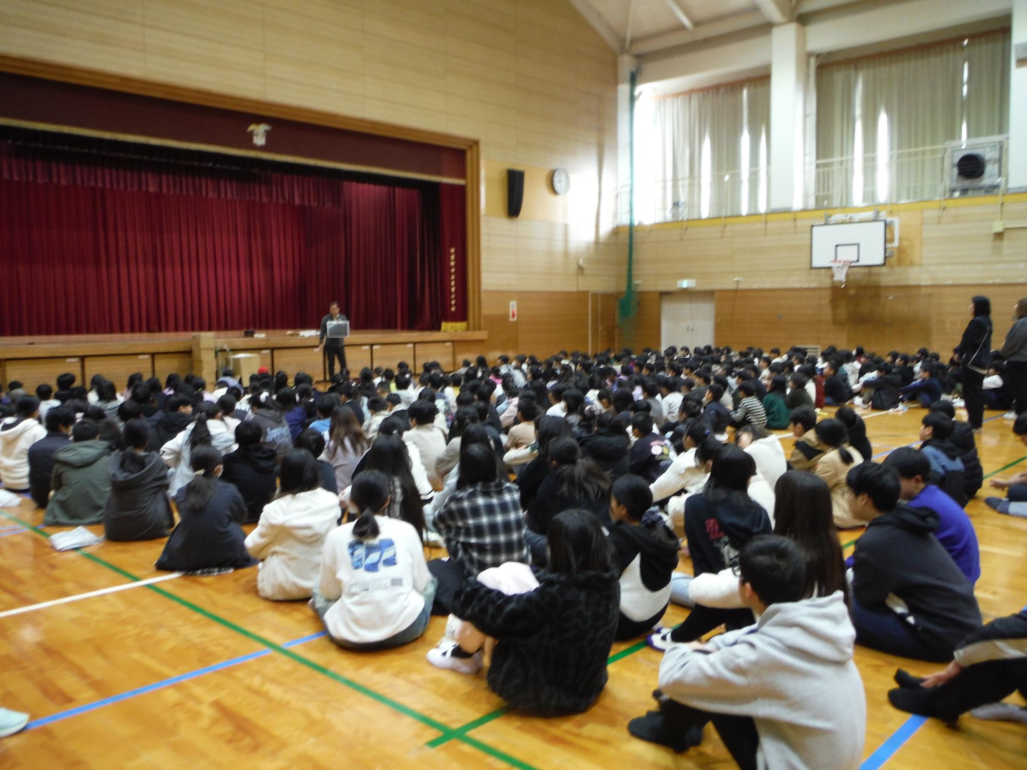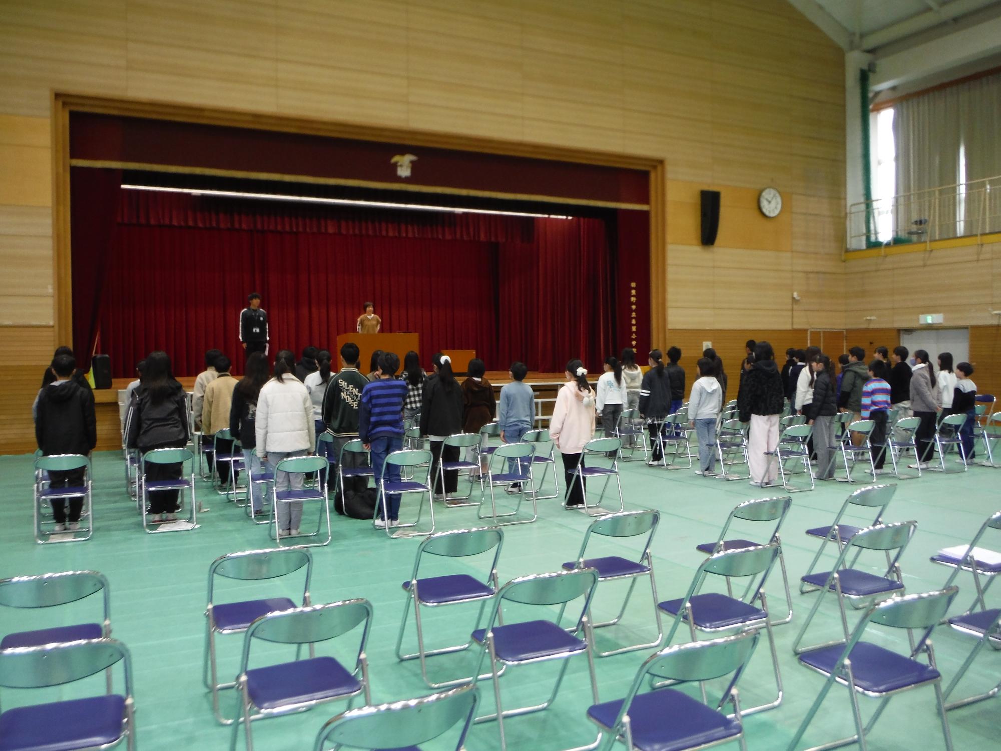 地震の避難訓練がありました。休み時間の実施だったので、少し混乱が起きるかと心配していましたが、事前に学習したことを意識して落ち着いて行動することができていました。避難中に一言も話さずに移動できた人と、少し話してしまった人とが半々くらいでした。緊急事態の時に当たり前に静かにし、人の話を聞けるように、普段から放送がかかった時や人が話している時に静かにする癖をつけること、逃げるための体力をつけること等、日常の中でできることを一人ひとりがしっかりとしていきたいです。