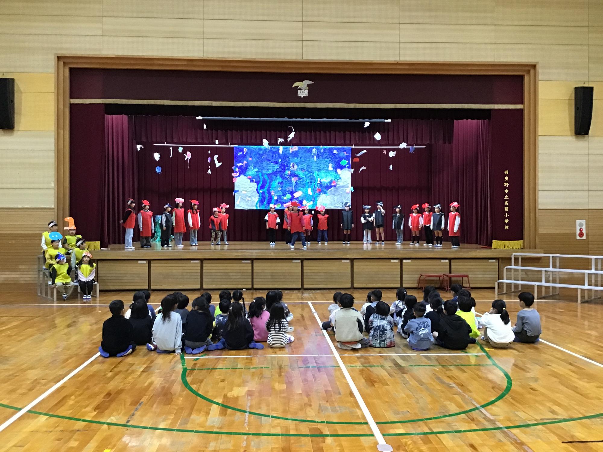 手作りの衣装、小道具、大道具を使って一生懸命大きな声でセリフや歌を歌ってくれました。1月から2年生一丸となり毎日毎日練習をし、ようやく今日本番を終えて子どもたちはホッっとしたようでした。この調子で3年生でも頑張ってほしいです。
