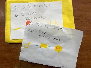 また、各教室では当日使用する「応援うちわ」も制作しました。各クラスカラーに合わせ、お揃いのうちわが完成!当日、このうちわで会場を盛り上げてくれることと思います。先日、紹介した学級旗づくりでは少し、心温まるメッセージを目にしました・・・。