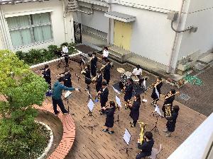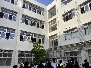 当日はあいにく曇り空ででしたが、吹奏楽部のみなさんが素晴らしい演奏を披露してくれました。その演奏をみんなで、校舎の窓から鑑賞しました!