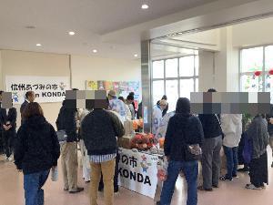 今年も参観当日に3年生が修学旅行の農家泊体験でお世話になった安曇野市のご協力で「信州あずみの市 inKONDA」を開催しました。3年生のみなさんが修学旅行先で農家さんのご自宅に滞在中の農業体験で植え付けたり、手入れした新鮮な野菜などを安曇野市から持って来ていただき、販売をしてくださいました。