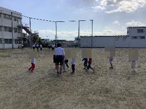 校区の保幼小中連携の一環で、中学校の昼休みに合わせて来ていただき、その時間を利用して、中学生と一緒にグランドで遊びました。園児のみなさんが来校することを朝の会で連絡したこともあって、多くの生徒がグランドに出てきてくれました。