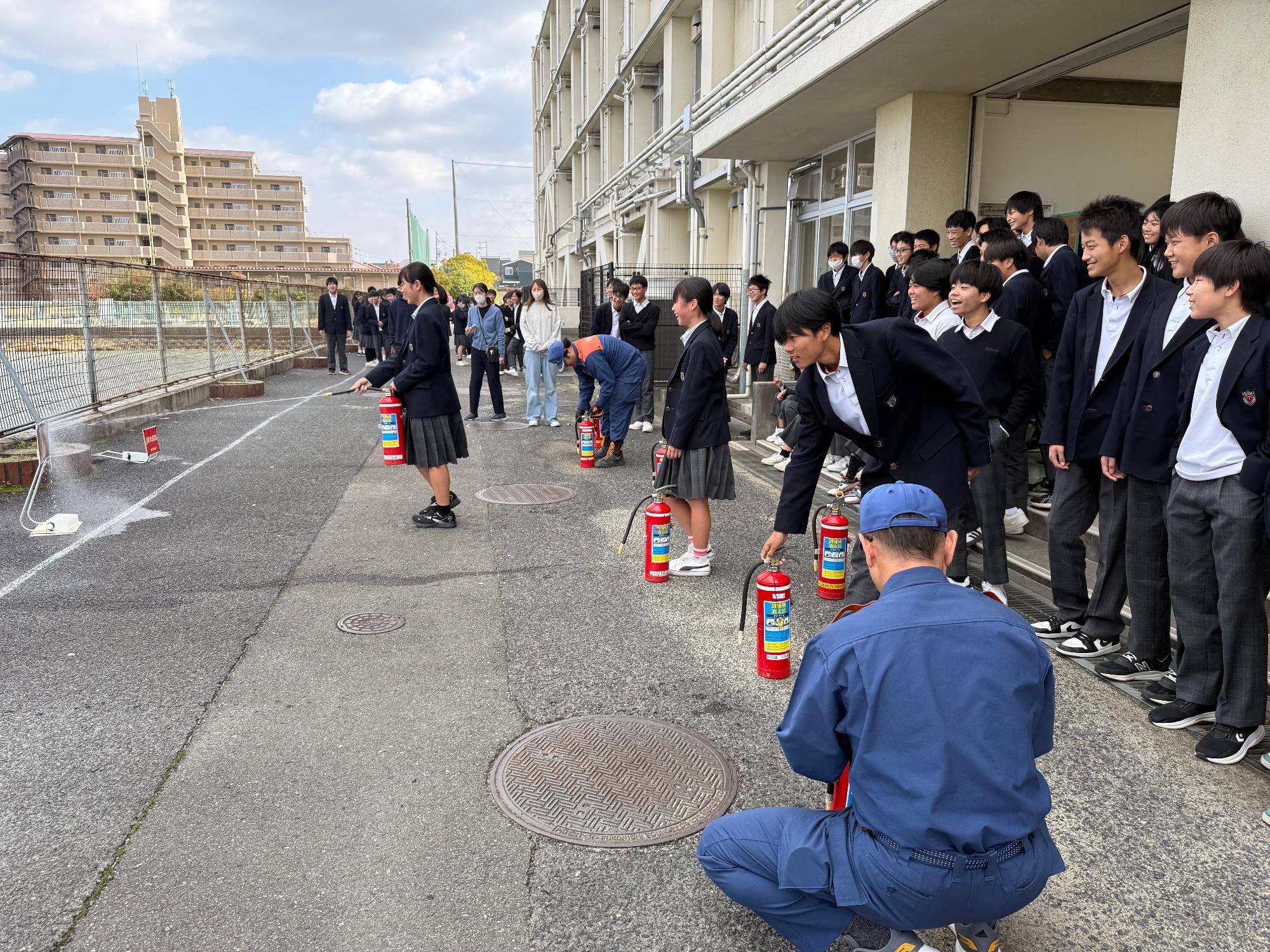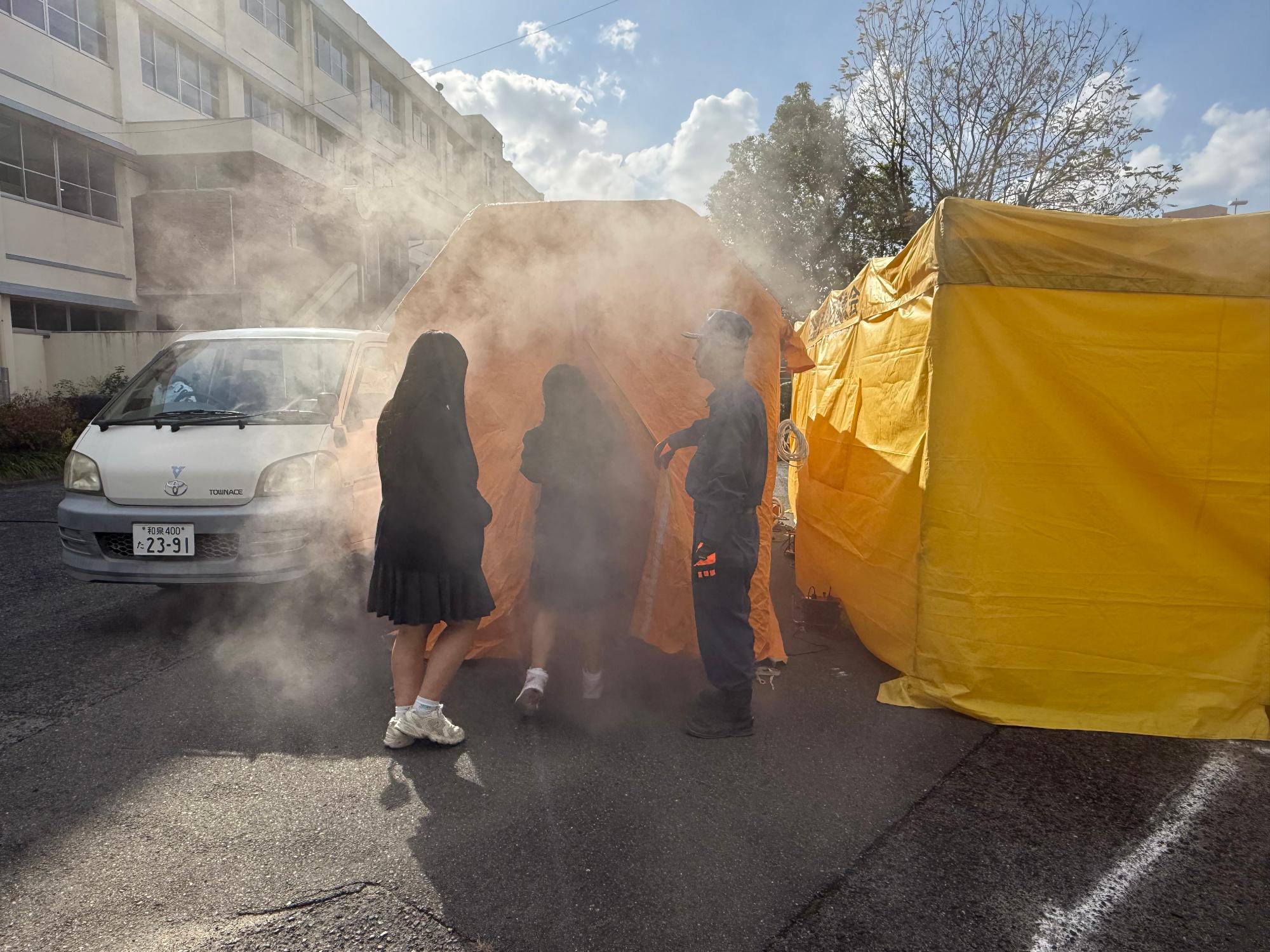 後半は羽曳野市役所危機管理課、柏羽藤消防署の方と、水消火器を使った消火訓練、煙霧体験を行いました。