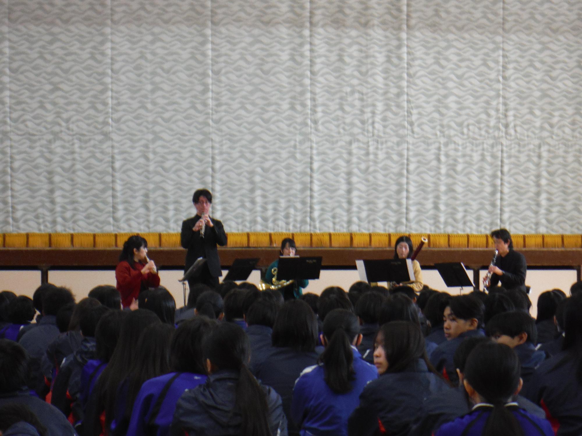 12月23日(火曜日)の4限目に芸術鑑賞会を実施しました。木管5重奏団「クインテット・カナン」のメンバーをお招きし、クラシックからポップスのアレンジ曲まで幅広いレパートリーにわたって、美しい楽器の音色を奏でていただきました。ラデッキー行進曲では生徒たちも音楽に合わせた手拍子で参加したり、楽しく音楽に触れ合う時間となりました。