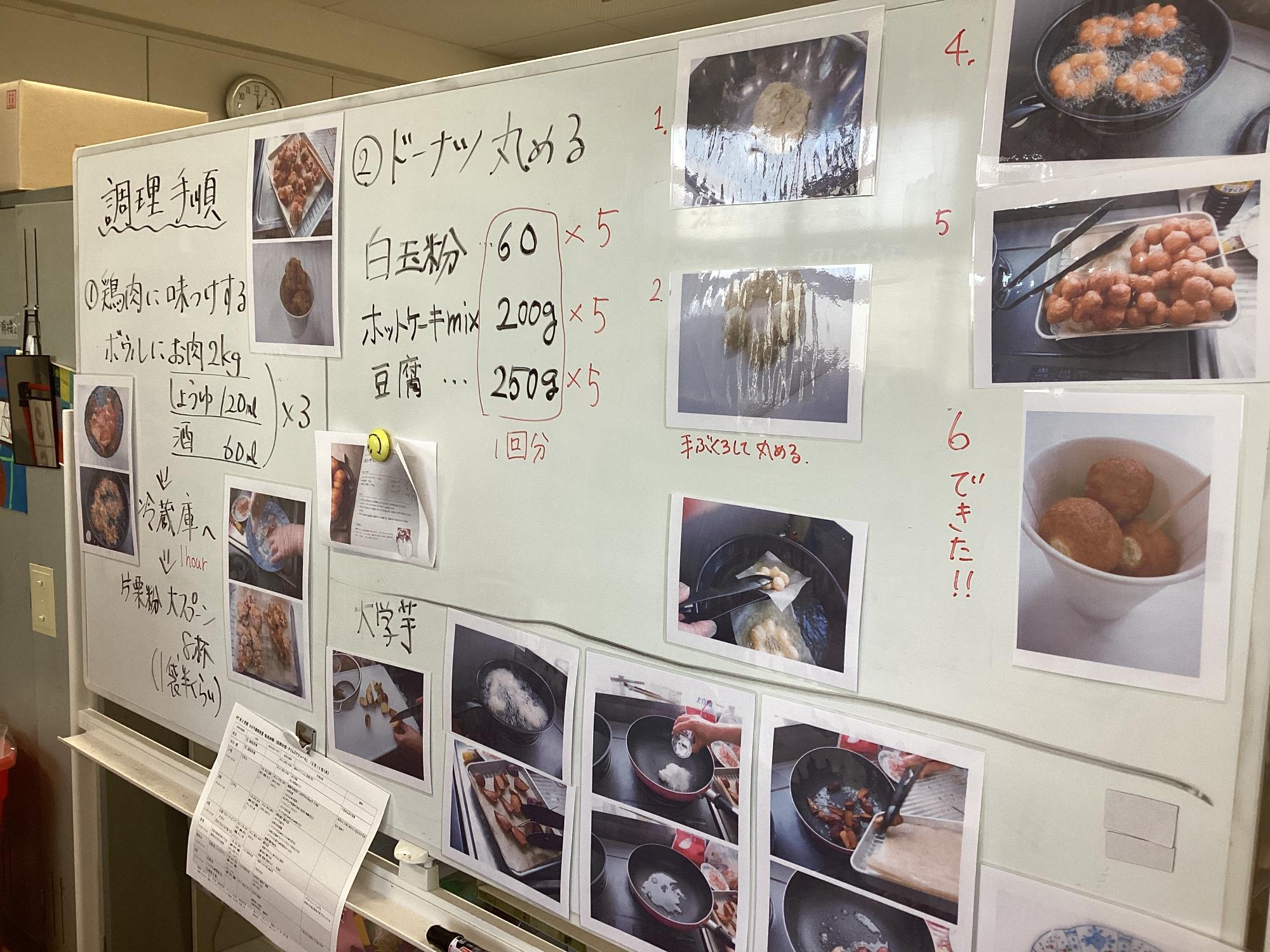この日は鶏の唐揚げ、ドーナツと大学芋という3種の調理、予約販売を行いました。当日は参加メンバーで協力して、手際よく調理も進み、みんなで協力しながら実習することができました。私もいただきましたが、どちらも上手にできており美味しかったです。他の先生方からもおいしいと好評を得ていました。