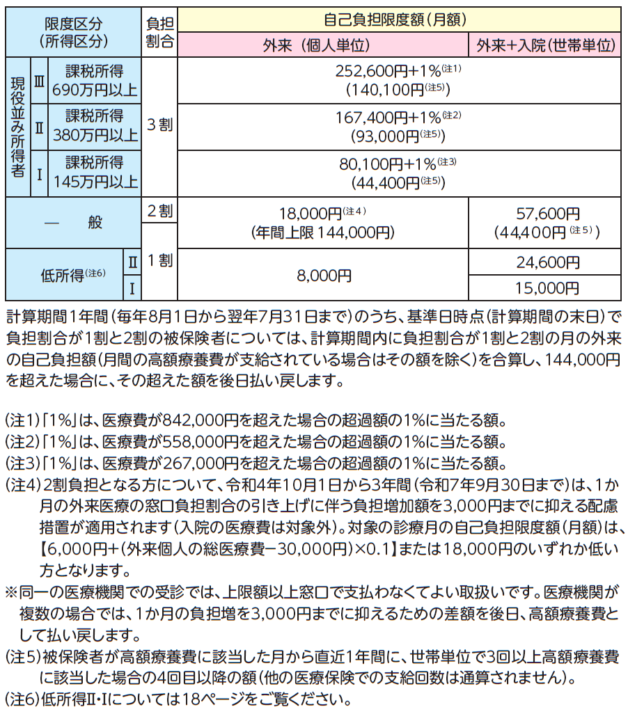 なお、限度区分を併記のない資格確認書を提示した場合、「現役並み所得者3」の自己負担限度額が適用され、「現役並み所得者2・1」との差額分を後日、高額療養費として払い戻します。