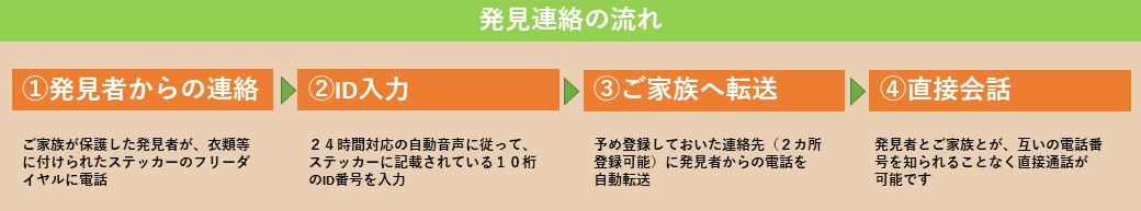 〇 認知症等による一人歩きで居場所が分からなくなる可能性のある高齢者等が、万が一行方不明になった際に、早期の発見・保護につなげることを目的としたステッカーです。利用者は衣服や靴、バック、杖などにステッカーを貼付けておくだけで、発見者がステッカーに記載されたフリーダイヤルに電話をすると、転送システムにより個人情報を保護した状態で、あらかじめ登録したご家族や支援者に直接電話がつながります。
