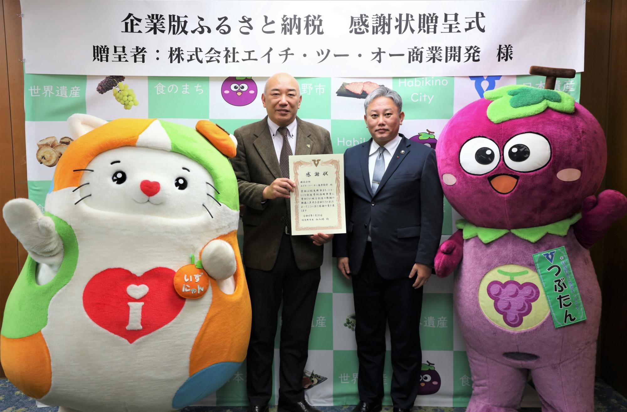 企業版ふるさと納税制度を活用した対象事業(羽曳野市まち・ひと・しごと創生推進事業)に対し、100万円のご寄附をいただきました株式会社エイチ・ツー・オー商業開発様へ感謝状の贈呈を行いました。