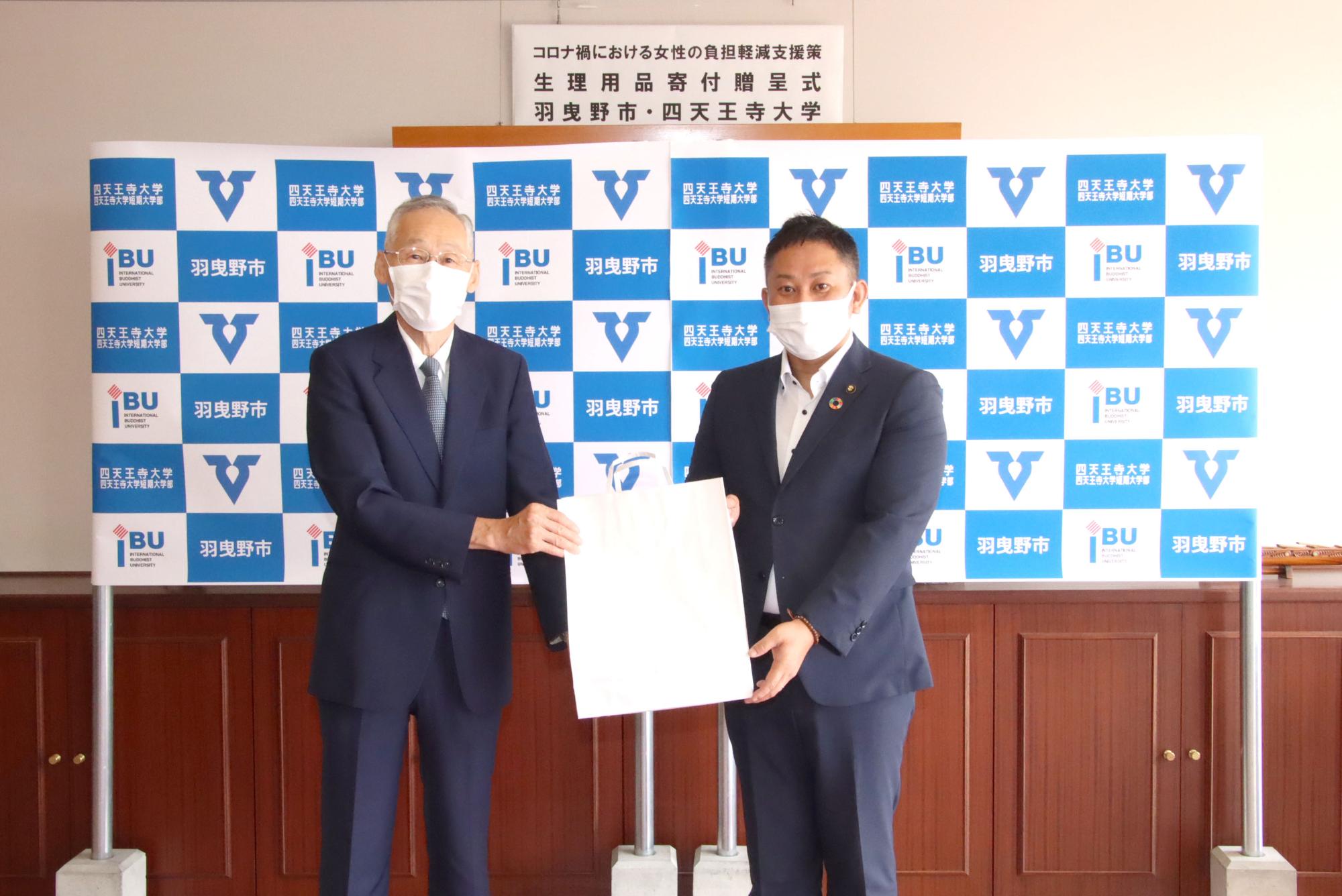 コロナ禍における女性の負担軽減支援策の一環として学校法人四天王寺学園四天王寺大学(代表して岩尾学長)へ生理用品120セットの寄贈をさせて頂きました。