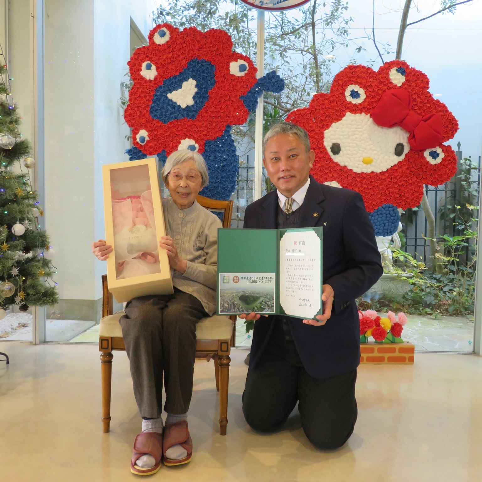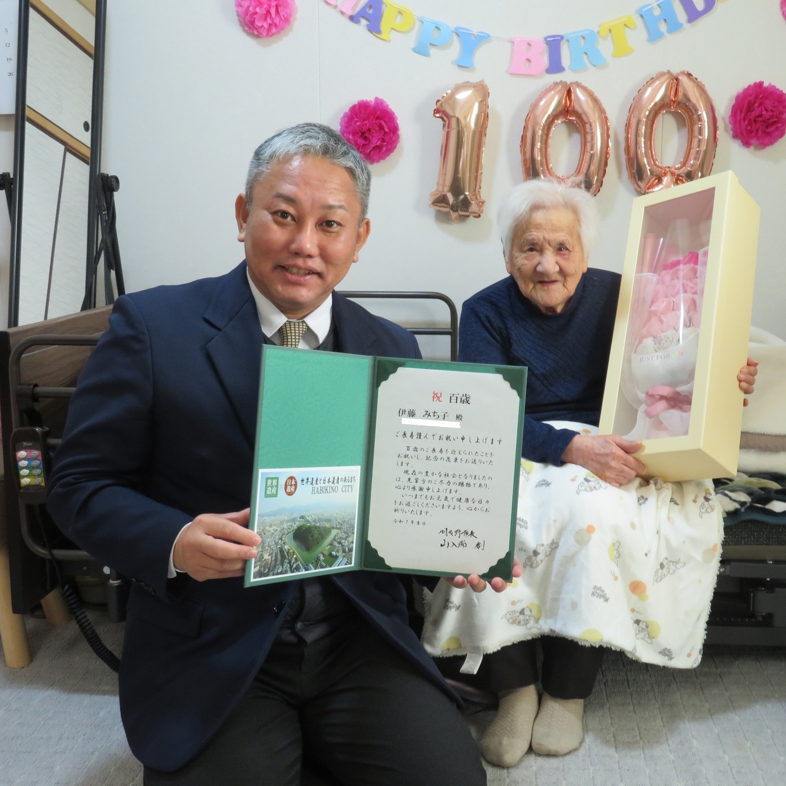 市内在住の100歳を迎えられた方を訪問し、ご長寿を祝福し花束を贈呈しました。今後ともお元気で健康な日々をお過ごしになりますよう祈念いたします。