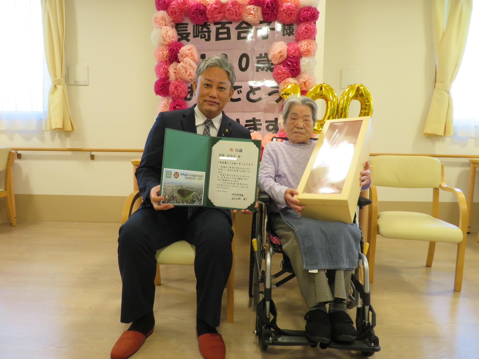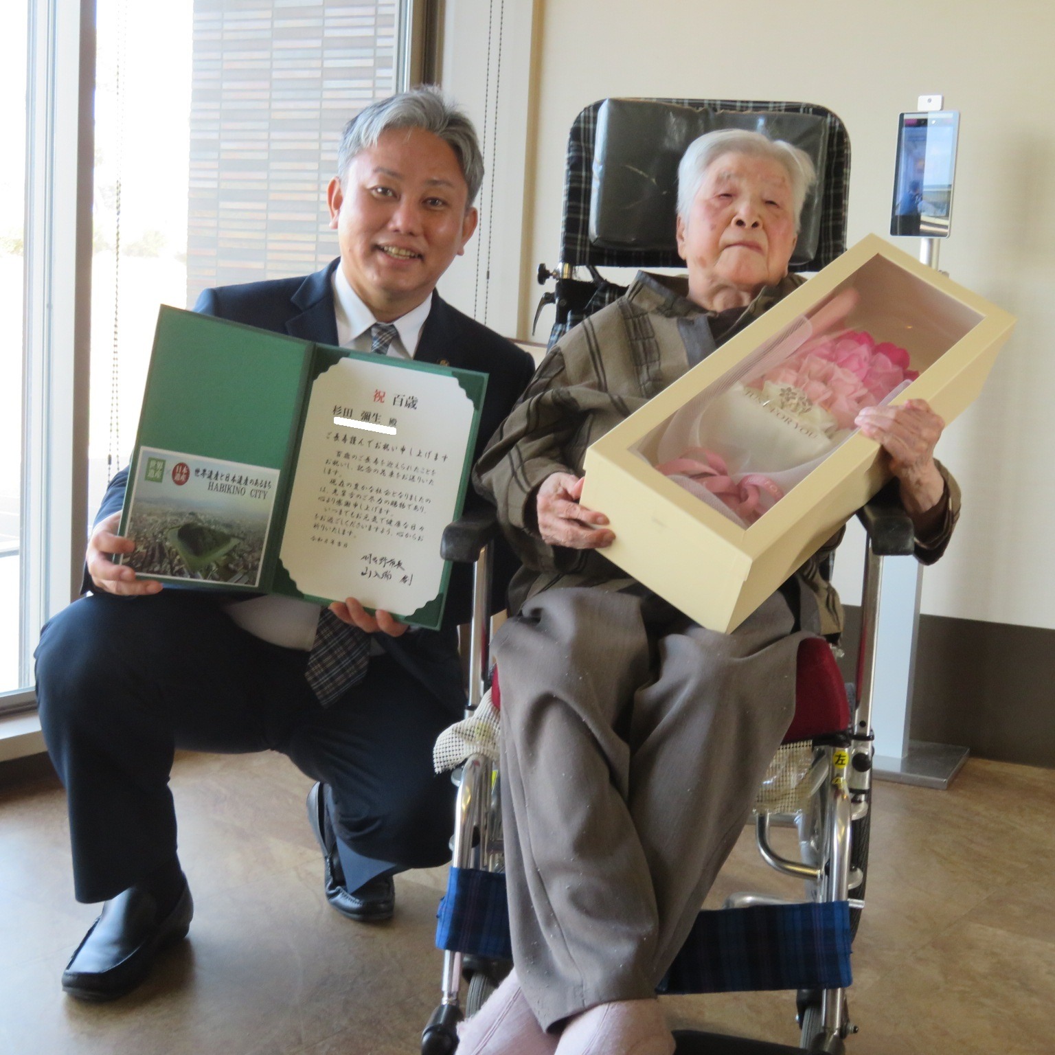 市内在住の100歳を迎えられた方を訪問し、ご長寿を祝福し花束を贈呈しました。今後ともお元気で健康な日々をお過ごしになりますよう祈念いたします。
