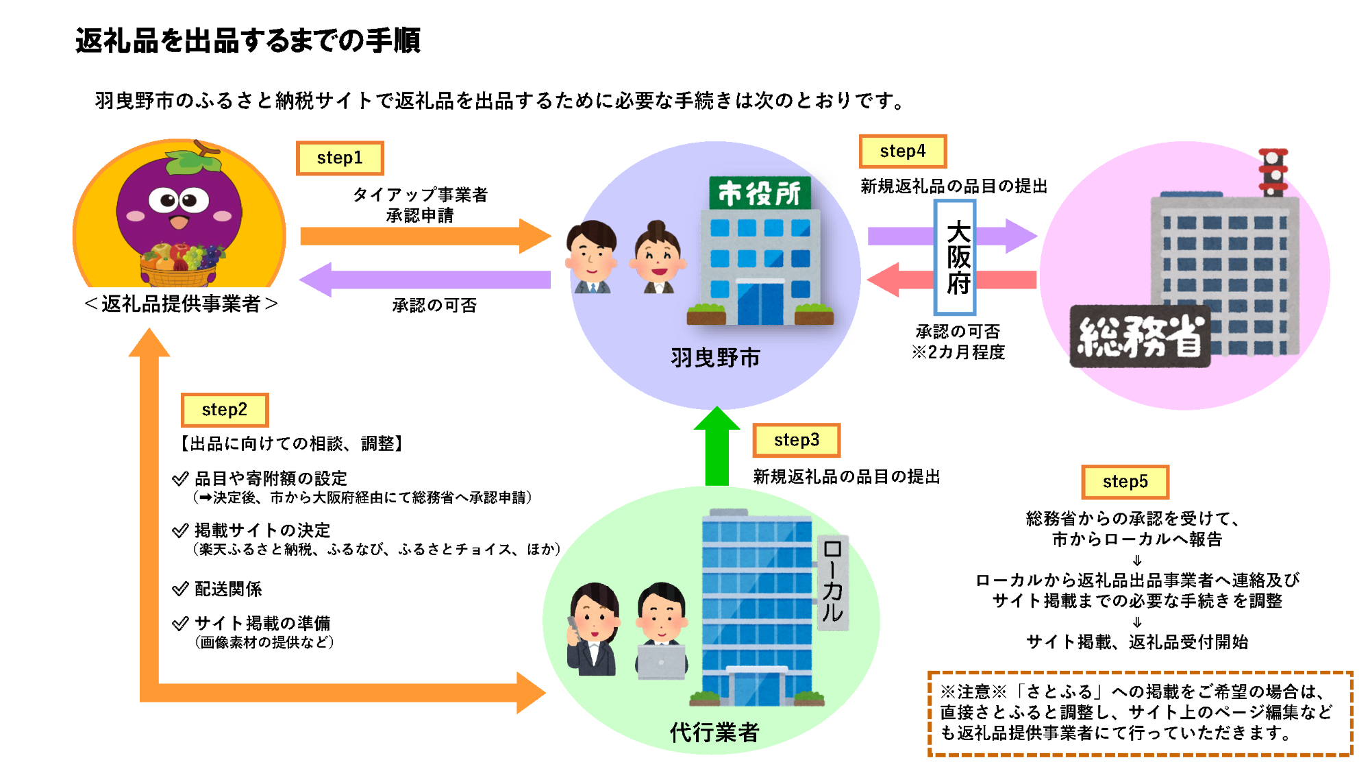 事業概要等について説明のうえ、出品を希望される返礼品の内容等をお伺いします。要件に該当する場合は、タイアップ事業参加申請書、誓約書兼同意書を提出していただきます。