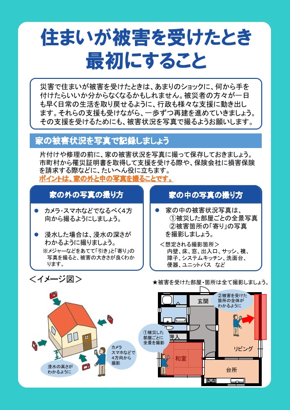 ※住まいが被害を受けたら、片付けや修理の前に、被害状況を写真に撮っておくと後で被害状況の確認ができます。(写真の撮り方(JPEG:190.8KB))